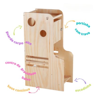 Com a nossa Torre, você coloca o seu filho na mesma altura do balcão, pia, bancada, seja da cozinha ou do banheiro! A criança consegue ver, na altura dos seus olhinhos, tudo o quê você vê... e as atividades do dia a dia ficam muito mais divertidas e você ainda ganha um pequeno ajudante independente.