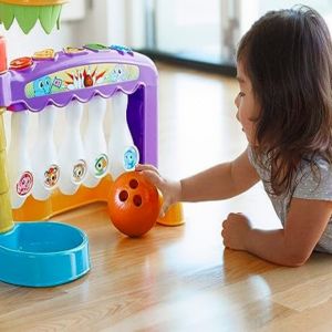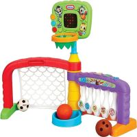 Triplique o jogo com o Little Tikes 3-em-1 Sports Zone! Mergulhe, chute e marque com os 3 esportes favoritos do seu filho: basquete, futebol e boliche!
